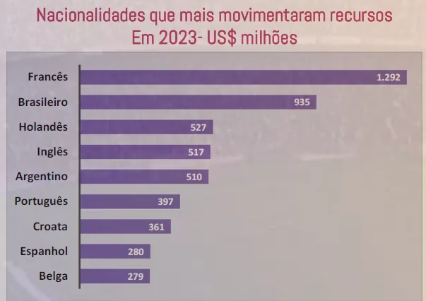 O terceiro ponto que merece destaque é ver que entre as principais vendas, o segundo maior volume é com atletas de nacionalidade brasileira, porém menos de 40% de um total de US$ 935 milhões (R$ 4,7 bilhões), ficam com os cofres dos times do Brasil.