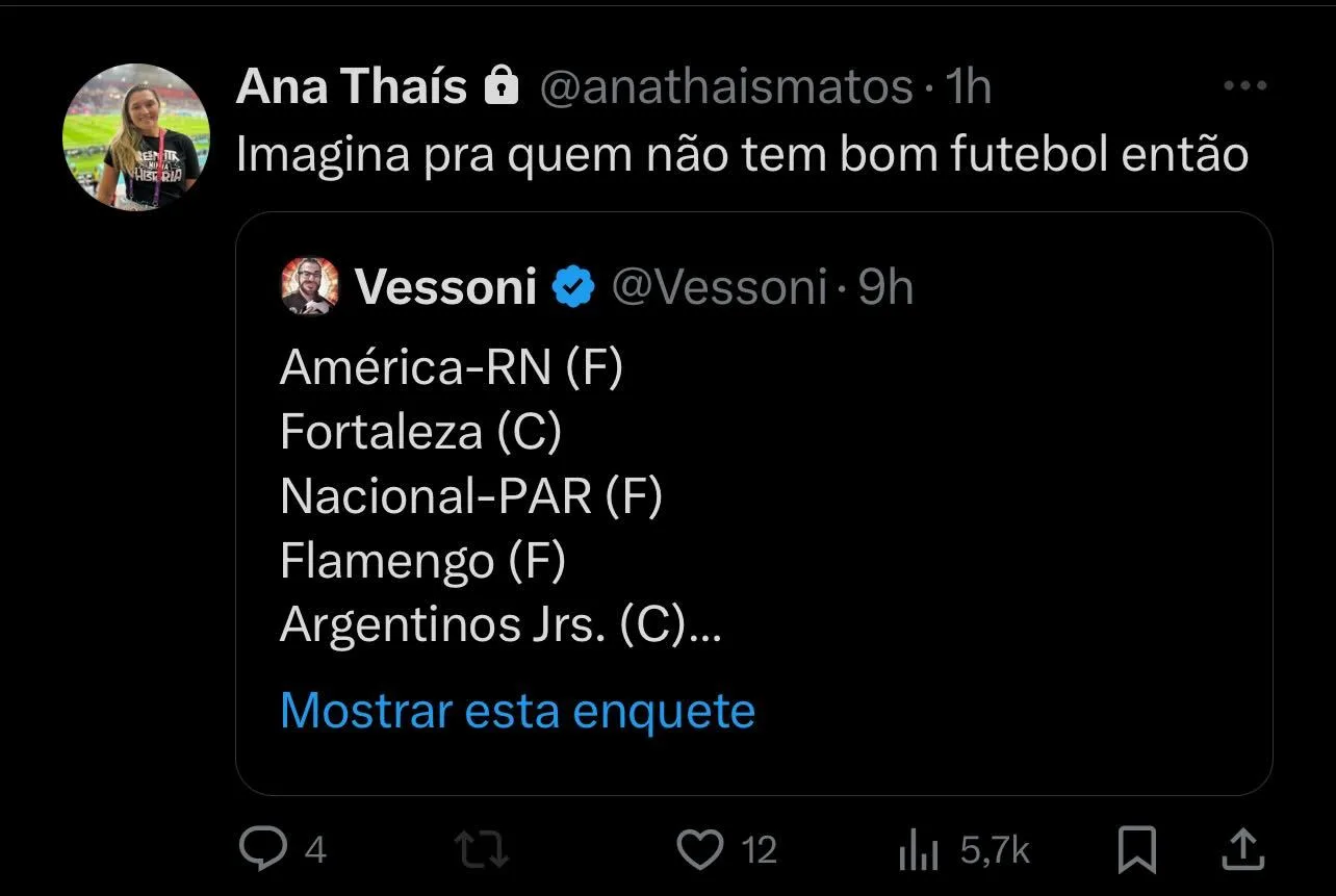 “Imagina pra quem não tem bom futebol então”, disparou Ana Thaís Matos, ao retuitar o post de Vessoni, que destacava os jogos do alvinegro contra América-RN (F), Fortaleza (C), Nacional-PAR (F), Flamengo (F) e Argentinos Juniors (F) a serem realizados no mês de maio.