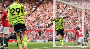 O Arsenal mostrou força aos 11 minutos com Havertz, que mandou cruzamento rasteiro para Trossard escorar com tranquilidade contra a meta de Onana e abrir o placar em Old Trafford.
