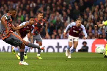 Jogador do Olympiakos marca gol de pênalti contra o Aston Villa na Conference League (Reprodução/X/Conference League)