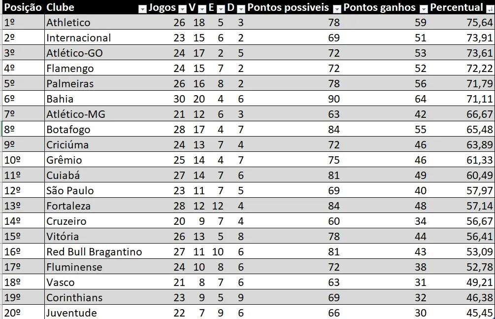 O Athletico Paranaense assumiu a liderança do Brasileirão ao vencer o Vasco pelo placar de 1 x 0. Além disso, a equipe rubro-negra se manteve como líder geral em relação ao percentual de pontos ganhos no ano, considerando os jogos oficiais dos times da primeira divisão.
