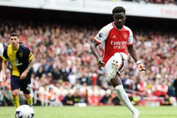 Saka marca durante cobrança de pênalti para o Arsenal contra o Bournemouth (Reprodução/X/Arsenal)