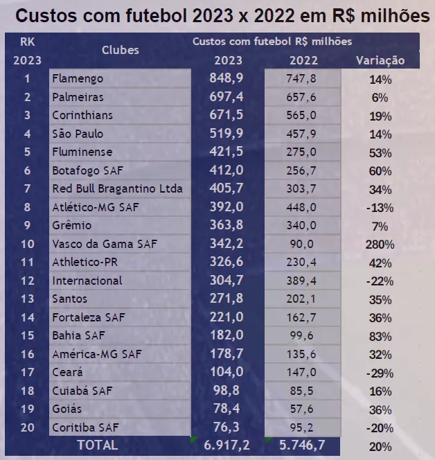 Em 2023 os 20 principais clubes do Brasil gastaram um total de R$ 6,9 bilhões para manter seus departamentos de futebol, conforme estudo da empresa Sports Value, especialista em marketing esportivo. Foi um aumento superior a 20% em relação aos valores gastos em 2022.