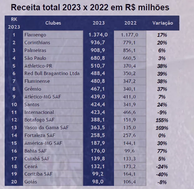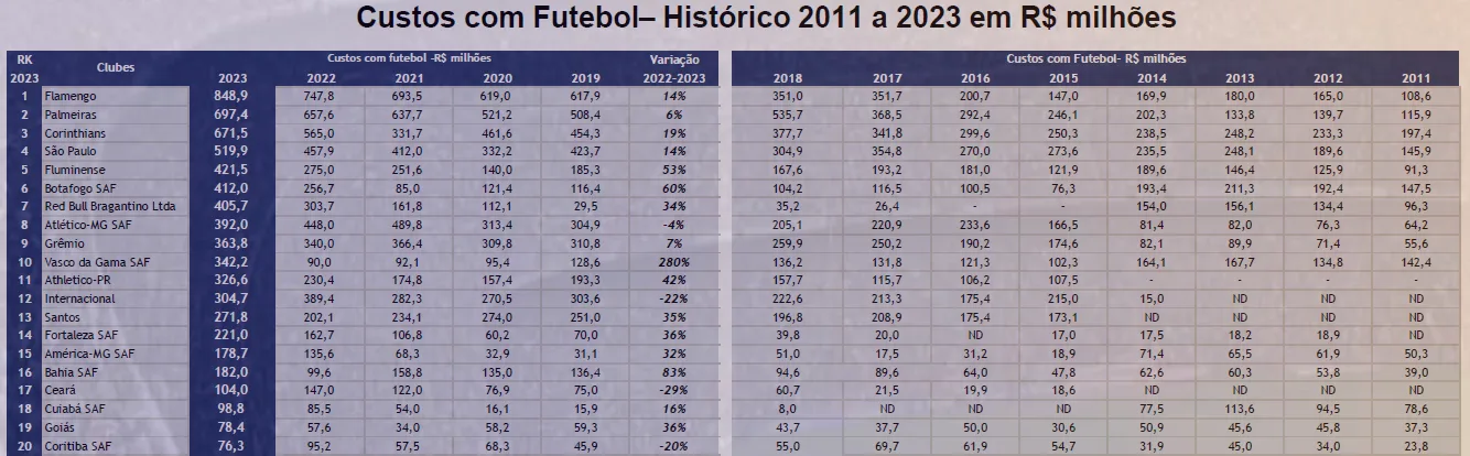 Veja abaixo um resumo dos custos de futebol em 2023 das principais equipes do futebol brasileiro