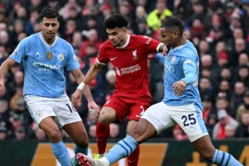 Luis Díaz disputa bola com jogadores do Manchester City em jogo pelo Liverpool (Reprodução/X/Luis Díaz)