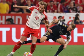 Toni Kroos e Harry Kane disputam a bola em confronto entre Real Madrid e Bayern de Munique pela Champions (Alexander Hassenstein/Getty Images)
