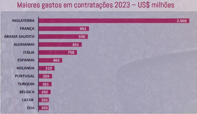 Conforme mapeado pela empresa Sports Value, especialista em marketing esportivo, esse valor é muito superior ao que outras ligas investiram no último ano. A França, por exemplo, investiu US$ 992 milhões (R$ 5,1 bilhões) enquanto a Arábia Saudita gastou US$ 970 milhões (R$ 4,9 bilhões).