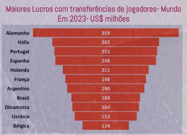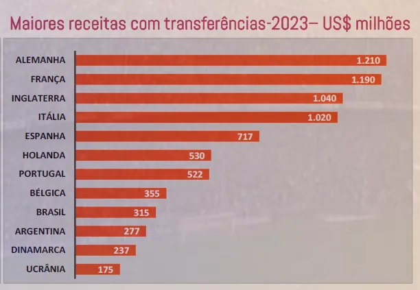 O Brasil foi o 9º país no mundo que mais faturou com vendas de jogadores em 2023, com um total de US$ 315 milhões (R$ 1,6 bilhão), superando Argentina, Dinamarca e Ucrânia, mas ficando atrás da Bélgica.