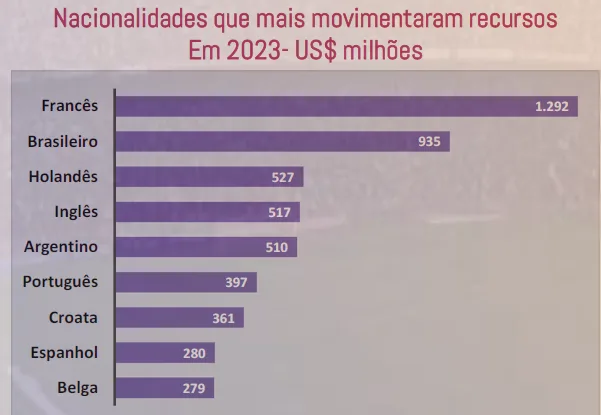 Porém, essa situação se aplica apenas aos clubes, já que quando analisamos as transferências de jogadores brasileiros, as cifras são bem maiores, chegando em US$ 935 milhões (R$ 4,8 bilhões), atrás apenas de atletas franceses.