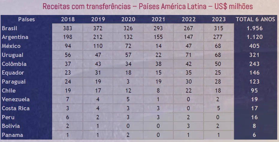 O mercado latino-americano movimentou US$ 857 milhões em transferências de jogadores. O valor é 29% maior do que o que foi arrecadado em 2022. E o Brasil segue sendo o país que mais fatura com venda de atletas, seguido da Argentina.