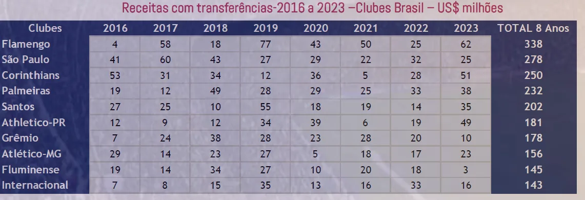 Veja abaixo um resumo das maiores receitas com transferências de jogadores no futebol brasileiro:
