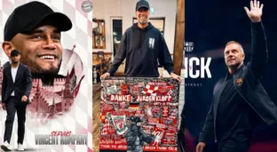 Kompany, novo técnico do Bayern de Munique, Klopp, ex-técnico do Liverpool e Hansi Flick, novo comandante (X oficial Bayern de Munique / X oficial Liverpool / X oficial Barcelona)