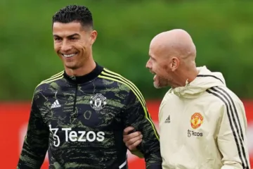 Cristiano Ronaldo ri enquanto conversa com Erik ten Hag no Manchester United (PA Images / Alamy Stock Photo)