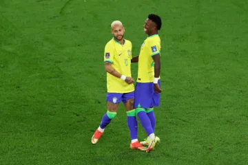 Neymar (à esquerda) e Vinícius Júnior (à direita) em campo pela seleção brasileira. (Créditos: Francois Nel/Getty Images)