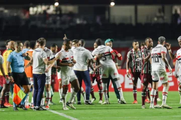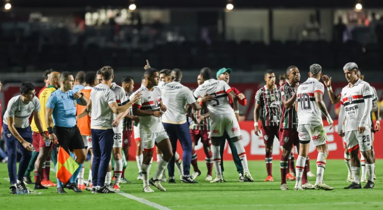 Jogadores de São Paulo e Fluminense discutem durante partida do Brasileirão Série A 2024 (Alexandre Schneider/Getty Images)