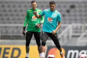 Thiago Silva e Ederson durante treino na seleção brasileira (Créditos: Lucas Figueiredo/CBF)