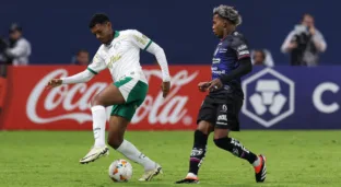 Luis Guilherme em disputa de bola contra o Independiente del Valle (Foto: Cesar Greco/Palmeiras/by Canon)