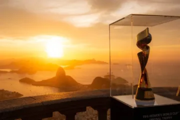 Taça da Copa do Mundo Feminina com fundo de Rio de Janeiro (Créditos: Divulgação FIFA)
