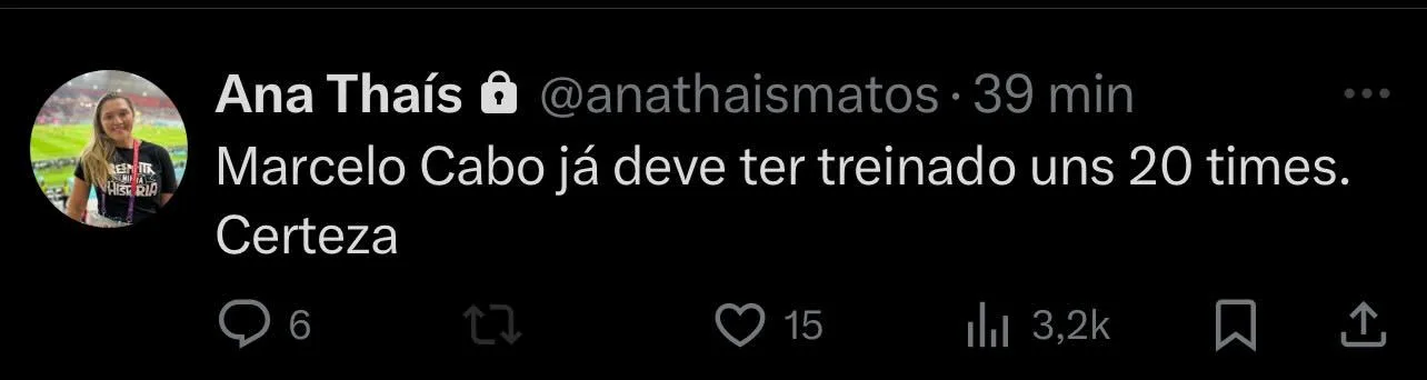 Acompanhando a transmissão do duelo entre Floresta e Confiança, pelo Brasileirão Série C, a jornalista Ana Thaís Matos, do Grupo Globo, utilizou as redes sociais para falar sobre o vasto currículo do técnico Marcelo Cabo, de 57 anos. No comentário feito, ela palpitou que o atual comandante do time cearense já passou por 20 times do futebol brasileiro.