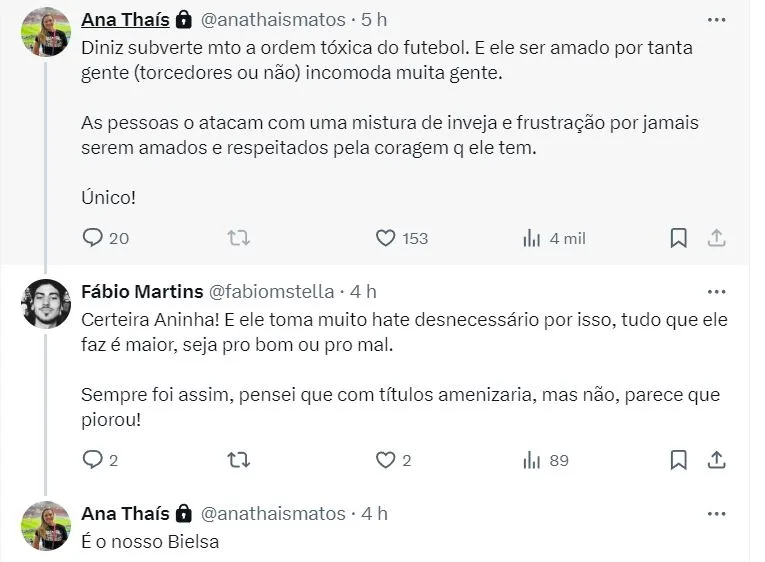 “Diniz subverte muito a ordem tóxica do futebol. E ele ser amado por tanta gente (torcedores ou não) incomoda muita gente. As pessoas o atacam com uma mistura de inveja e frustração por jamais serem amados e respeitados pela coragem q ele tem. Único”, escreveu Ana Thaís.