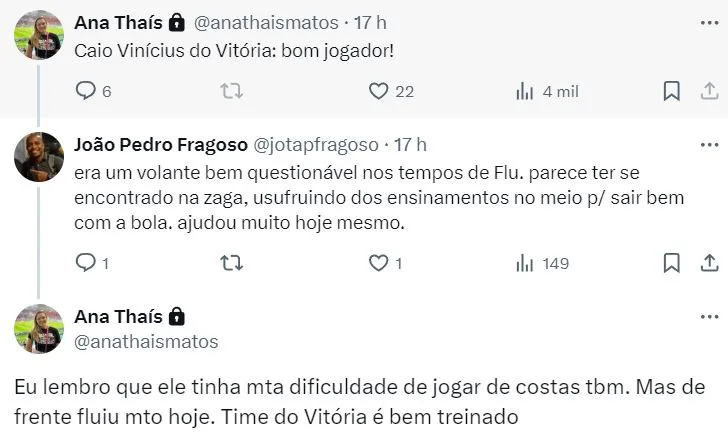 Em sua conta oficial no Twitter, Ana Thaís Matos, que comentou a partida entre Fluminense x Vitória pelo Premiere, escreveu: “Caio Vinícius, do Vitória: bom jogador”. O atleta, inclusive, é cria de Xerém e foi revelado pela base do Tricolor.
