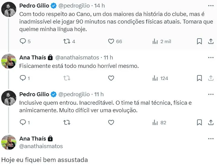 No Twitter, Ana Thaís Matos criticou a montagem do elenco do Fluminense, a situação fisicamente dos jogadores e também ligou o alerta para o segundo semestre. Vale lembrar que o Tricolor é o último colocado com apenas uma vitória em 12 rodadas.