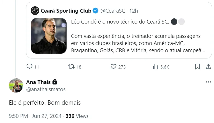 A campanha irregular do Ceará no Brasileirão Série B culminou na demissão do técnico Vagner Mancini e contratação do ex-Vitória Léo Condé. O anúncio do acordo animou a jornalista Ana Thaís Matos, que vibrou com o anúncio do Vôzão.