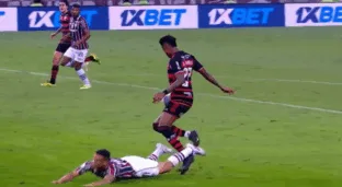 “No meu ponto de vista é uma ação de jogo e aí, na sequência, com a perna, o Calegari acaba atingindo o Bruno Henrique, sem nenhuma intenção, mas é imprudente. O Rafael Klein toma a decisão de campo”, conclui PC de Oliveira.