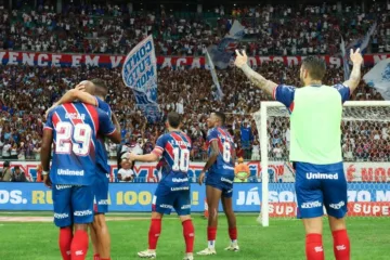 Elenco do Bahia comemorando vitória no Brasileirão (X oficial Bahia)