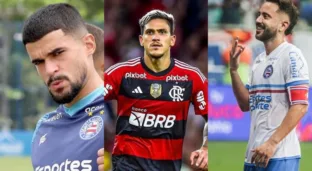 Cauly, Everton Ribeiro e Pedro, jogadores do Bahia e Flamengo (Felipe Oliveira / Tiago Caldas / ECB / Marcelo Cortes / Flamengo)
