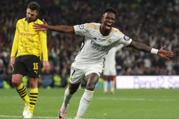 Vinícius Júnior comemorando o segundo gol do Real Madrid na final da Champions League. (Créditos: Lars Baron/Getty Images)