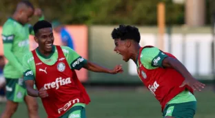 Estêvão e Endrick comemoram gol em treino do Palmeiras (Foto: Cesar Greco/Palmeiras/by Canon)