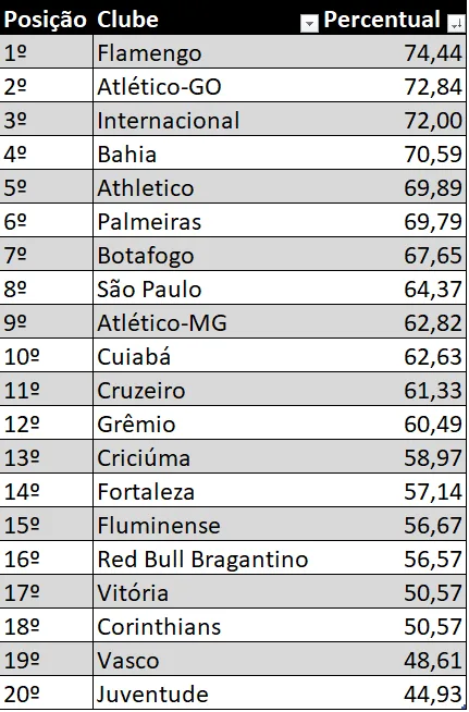 Já Internacional e Bahia aparecem na terceira e quarta posições do ranking, fechando os times que tem mais de 70% de aproveitamento no ano entre os clubes que disputam a Série A do Campeonato Brasileiro.