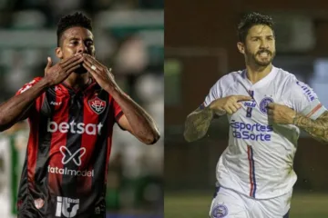 Willian Oliveira e Everaldo, jogadores do Vitória e Bahia, respectivamente (X oficial Vitória / X oficial Bahia)