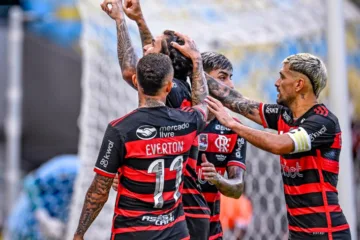 Elenco do Flamengo comemorando gol pelo Brasileirão (Créditos: Marcelo Cortes/ Flamengo)