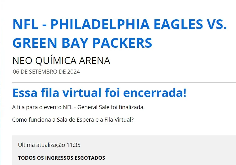 Esse aviso merece ser reforçado, uma vez que sem entradas disponíveis é muito provável que cambistas e golpistas ofereçam ingressos falsos para a partida entre Eagles x Packers.