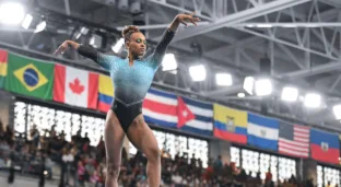 Rebeca Andrade durante a disputa da trave nos Jogos Pan-Americanos de Santiago, em 25 de outubro de 2023. (Créditos: Cal Sport Media via AP Images