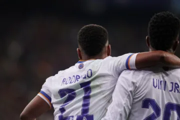 Vinicius Junior e Rodrygo comemorando gol durante a Liga dos Campeões contra o Shakhtar Donetsk (Vitalii Kliuiev / Alamy Stock Photo)