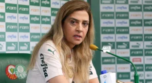 Leila Pereira, presidente do Palmeiras, em entrevista coletiva. (Foto: Fabio Menotti/ Palmeiras)
