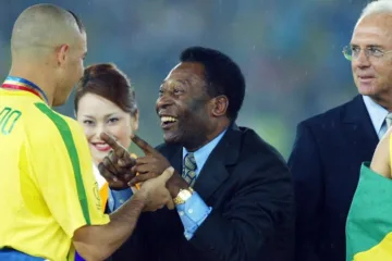 Ronaldo é festejado por Pelé na conquista do Penta, enquanto Beckenbauer observa (Divulgação/Fifa)