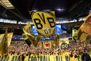 Presentes no estádio Wembley, vários torcedores do Borussia Dortmund protestaram contra o acordo de patrocínio fechado com a empresa fabricante de armas Rheinmetall. A manifestação ocorreu neste sábado (1), durante a final de Uefa Champions League contra o Real Madrid.
