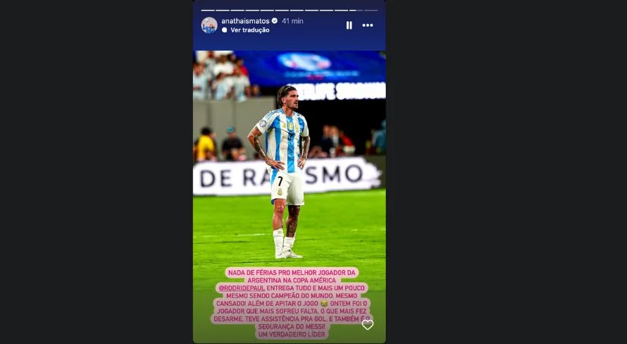 “Nada de férias para o melhor jogador da Argentina na Copa América. De Paul entrega tudo e mais um pouco, mesmo sendo campeão do mundo, mesmo cansado. Além de apitar o jogo, ontem foi o jogador que mais sofreu falta, o que mais fez desarme, teve assistência pra gol, e também é o segurança de Messi. Um verdadeiro líder”, disparou Ana Thaís.