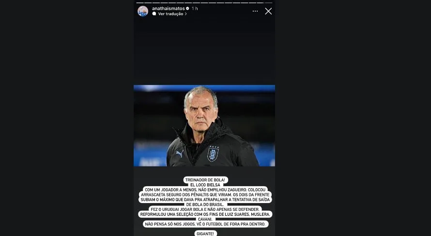 A jornalista Ana Thaís Matos, do Grupo Globo, rasgou elogios ao técnico Marcelo Bielsa, comandante da seleção uruguaia, após a Celeste despachar o Brasil nas penalidades, em confronto das quartas de final da Copa América, neste sábado (06), em solo norte-americano.