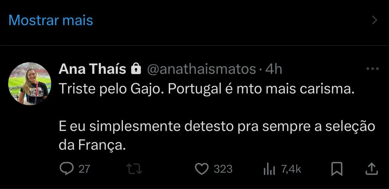 “Triste pelo Gajo. Portugal é muito mais carisma. E eu simplesmente detesto pra sempre a seleção da França”, disparou Ana Thaís.