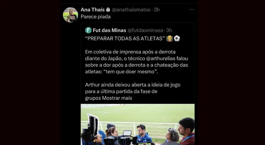 “Parece piada”, disparou Ana Thaís, de forma sucinta, ao compartilhar um post no “X” sobre as declarações dadas pelo treinador, após o amargo revés diante do Japão.