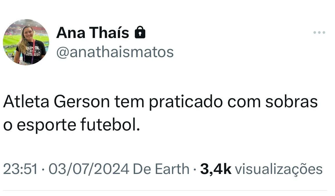 “Vale uma matéria sobre a preparação física do Gerson após o afastamento por questão de saúde. Eu tenho a sensação (sem olhar os dados) que ele deve ser o meia com mais sprints, mais mudança de direção e mais tempo em contato com a bola no Brasileirão 2024. Ele me parece mais forte e ágil”, destacou Ana Thaís em seu perfil no “X”.