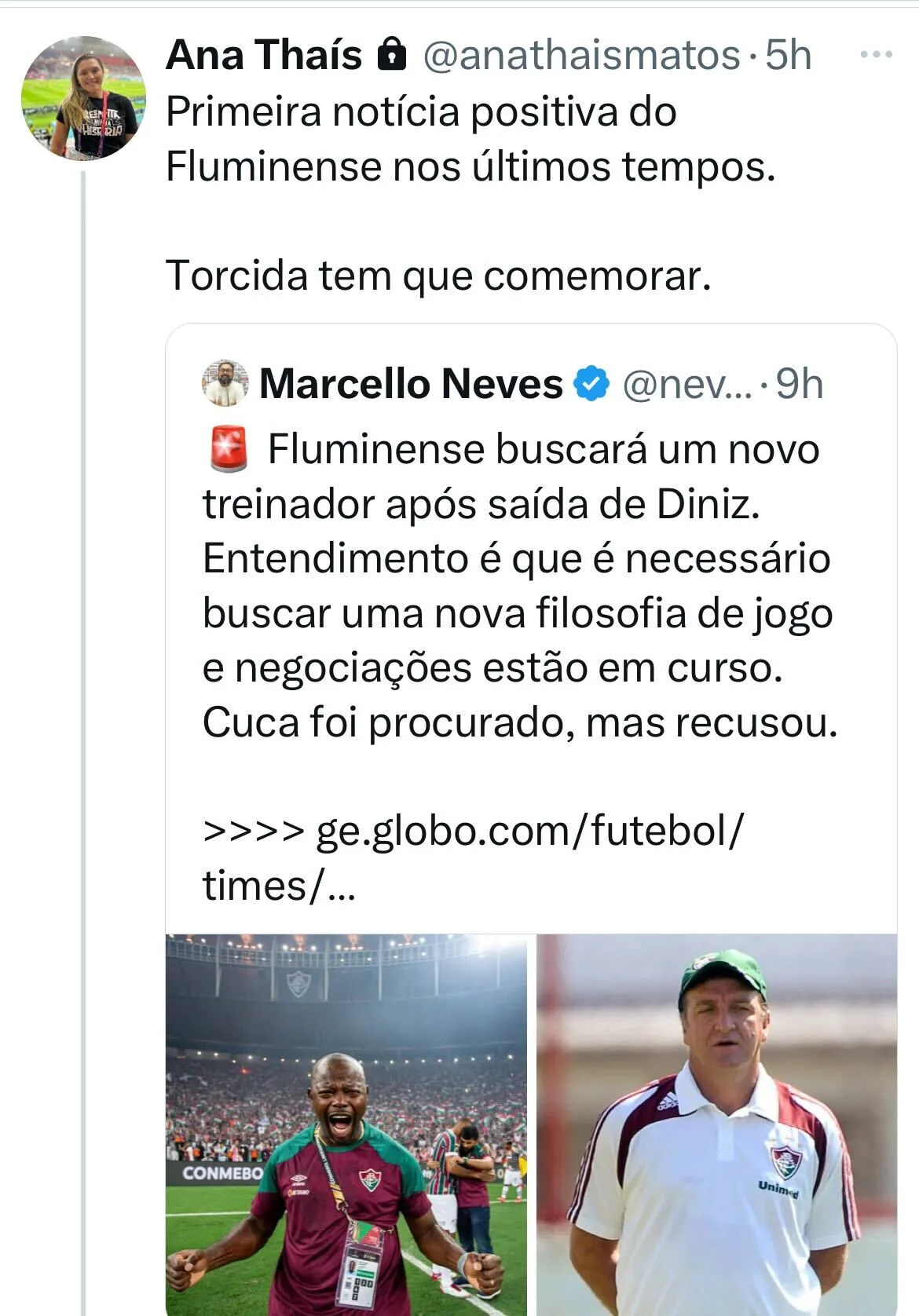 “Primeira notícia positiva do Fluminense nos últimos tempos. Torcida tem que comemorar”, escreveu Ana Thaís nas redes sociais sobre Cuca ter recusado assumir a vaga deixada por Fernando Diniz.