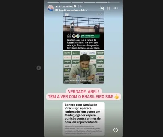 “Verdade, Abel! Tem a ver com o brasileiro sim”, ironizou Ana Thaís na legenda de um stories publicado. No post em questão, ela colocou as aspas do treinador do Palmeiras e recortou a manchete da notícia sobre o crime de ódio que Vini foi vítima antes de um jogo do Real Madrid, em janeiro de 2023.