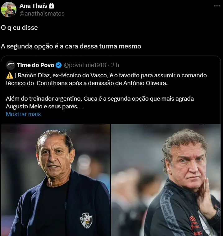 Ana Thaís ironiza possível interesse do Corinthians em Cuca: “É a cara dessa turma”