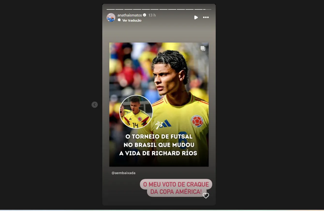 “O meu voto de craque da Copa América.”, escreveu Ana Thaís, em publicação nos stories do Instagram.